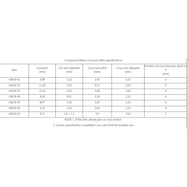 The compound belt is a high-density, balanced spiral belt with multiple spirals and cross rods per pitch, resulting in minimal apertures and a flat surface. This structure ensures a close and flat mesh, ideal for conveying very small items. Its uniform heat transfer and smooth surface make it perfect for applications like biscuit baking and sorting small mechanical components. Popular for its durability and efficiency, the compound weave is a top choice in various industries, including food processing and precision manufacturing.